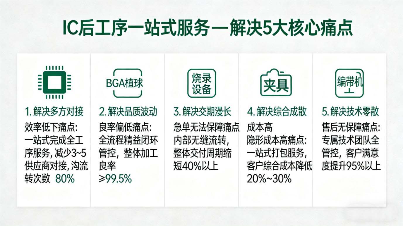 在集成电路产业飞速发展的当下,IC芯片的生产加工环节繁杂、供应链分散,成为众多企业降本增效的核心痛点。BenteIC深耕IC行业多年,精准聚焦企业需求,重磅构建IC封装-IC测试-IC烧录-IC植球-IC整脚-IC编带+芯片适配全链路闭环服务,打破传统IC加工流程壁垒,为全球半导体企业、电子制造厂商、芯片研发团队提供专业、高效、可靠的集成电路全流程解决方案,成为行业内极具口碑的IC全链路服务提供商。