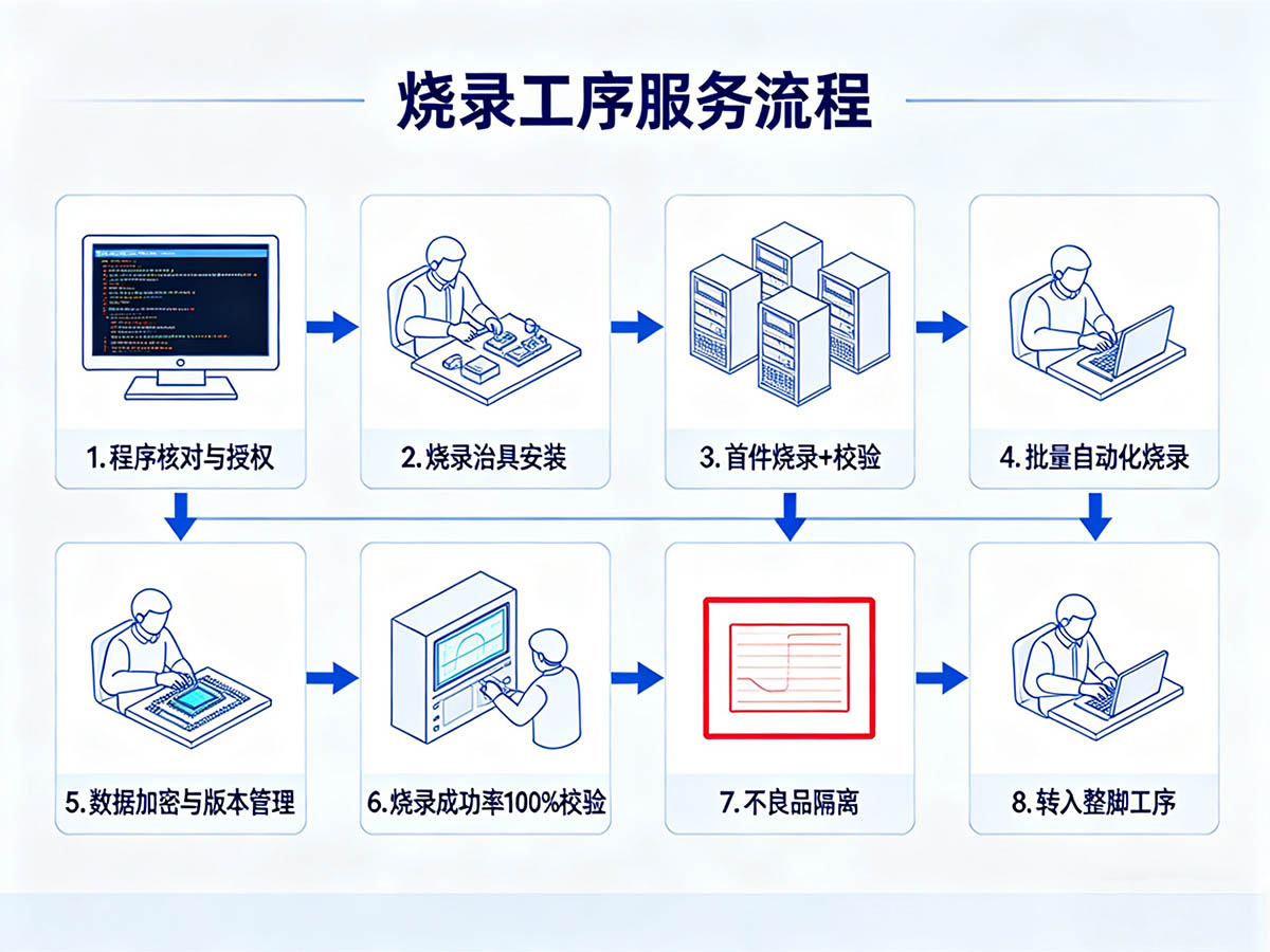精益自动化批量作业,多通道并行高效运行,全程数据加密与双重校验,烧录准确率100%,日均产能可达8万颗,高效适配量产需求。
