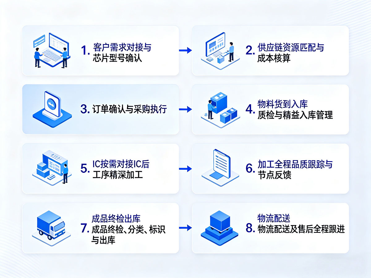 整合优质供应链资源,以精益化渠道管理保障稳定供货,与IC后工序精深加工无缝配套,实现“芯片适配+精密加工”一站式服务。